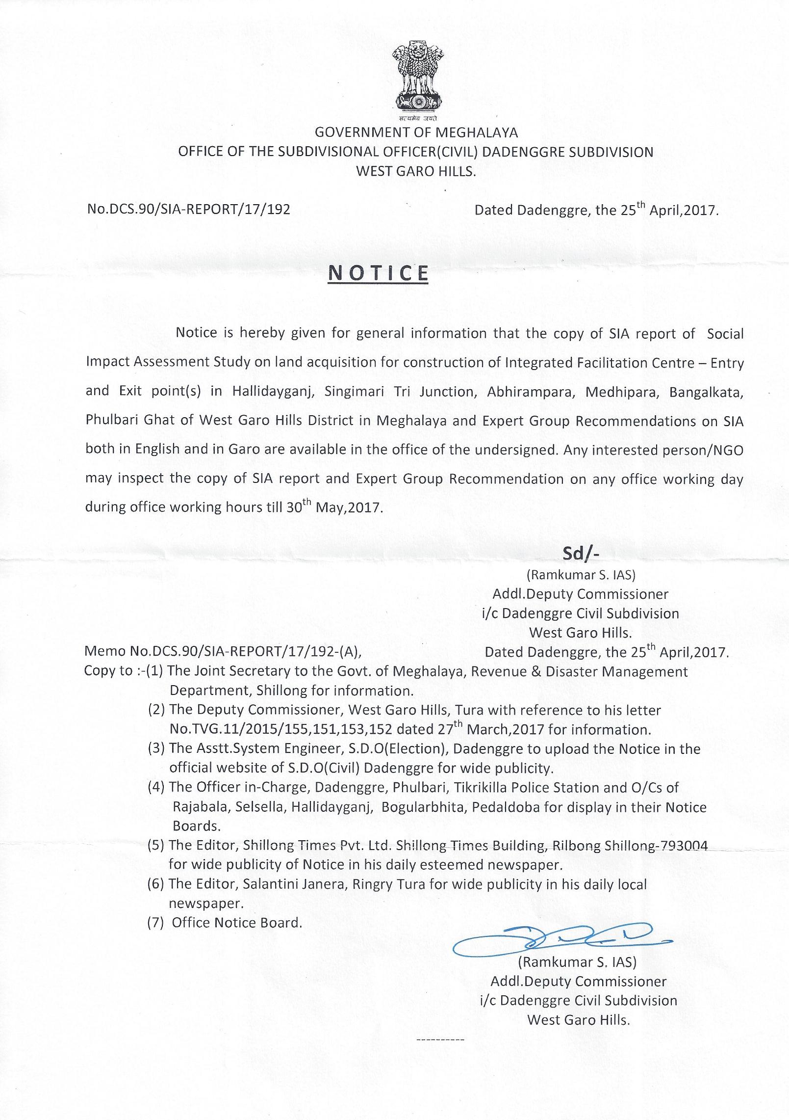 Notice is hereby given for general information that the copy of SIA report of Social Impact Assesment Study on land acquisition for construction of Integrated Facilitation Centre - Entry and Exit ponit(s) in Hallidaygang, Singimari Tri junction, Abhirampara, Medhipara, Bangalkata, Phulbari Ghat of West Garo Hills District in Meghalaya and Expert Group Recommendations on SIA both in English and in Garo are available in the office of the undersigned. Any interested person/NGO may inspect the copy of SIA report and Expert Group Recommendation on any office working day during office hours till 30th May, 2017.